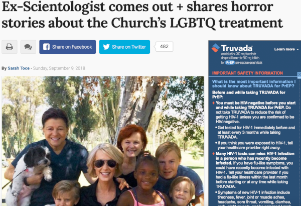 “Eight years ago, Michelle LeClair was wealthy, successful and a self-described “poster girl for Scientology” who donated millions to the controversial church. But she says her seemingly perfect life was thrown into turmoil after she came out as gay to the church,” ( article by Johnny Dodd & Tierney McAfee, People Magazine)